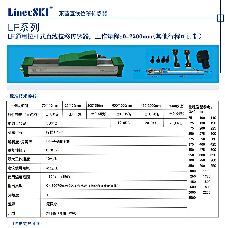 LF滑塊式直線位移傳感器(別名:電子尺,電阻尺,電位器,位移傳感器)原理:電位計原理,所有傳感器為位置測量型,用于調節系統(控制系統)和測量系統中,對位移和長度進行直接測量,輸出直流電壓信號,也可以通過內置或者外置的V/A變送模塊講信號轉換成標準的0-5V、0-10V或者4-20mA直流信號,也可以遠距離傳輸控制要求。LF滑塊式直線位移傳感器(別名:電子尺,電阻尺,電位器,位移傳感器)輸出位移變化:0-100%給定輸入工作電壓(隨位移變化而變化)。