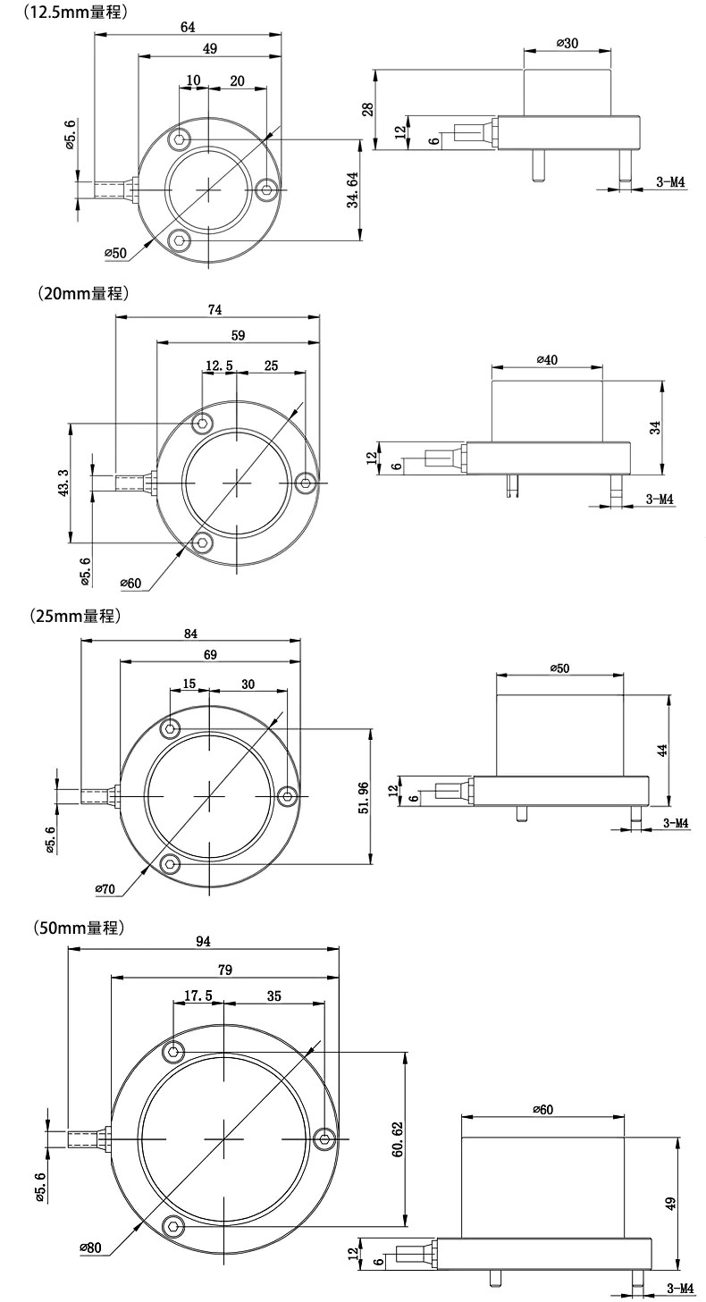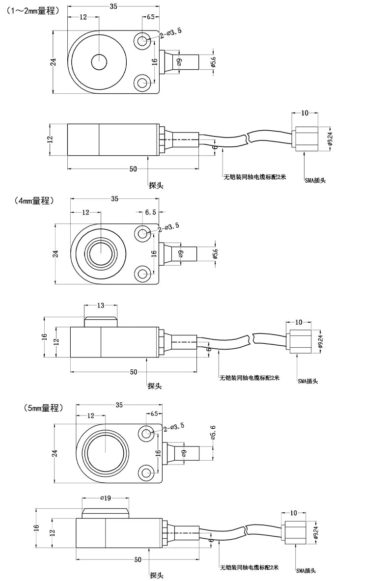 測(cè)量量程 | 1mm | 2mm | 4mm | 5mm | 12.5mm | 20mm | 25mm | 50mm |