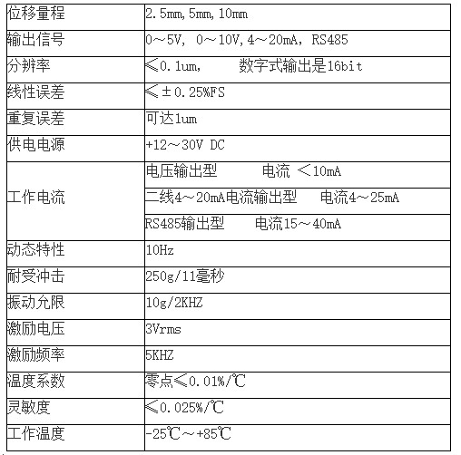 LVDT位移傳感器性能參數: