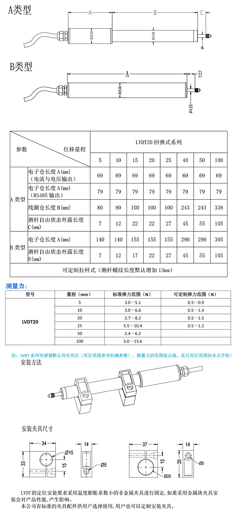 LVDT20回彈式位移傳感器機械安裝尺寸: