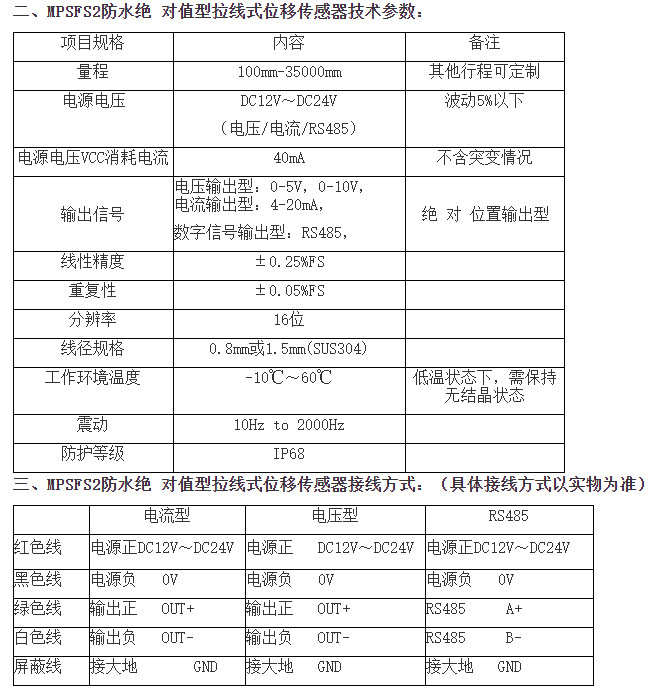 一、MPSFS2防水絕 對值型拉線式位移傳感器產品特征: