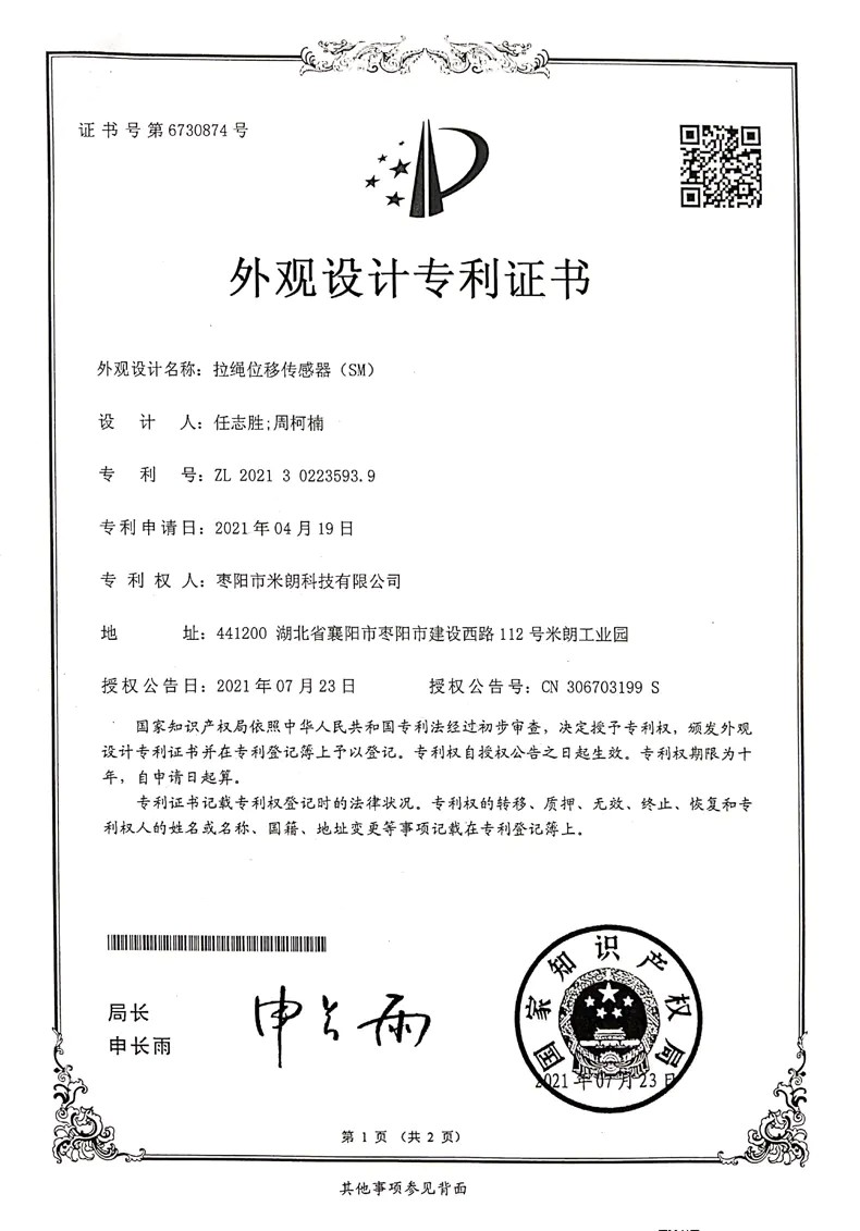 SM-M型拉繩位移傳感器的接線方式與安裝尺寸(底面螺絲安裝式)、其他證書: