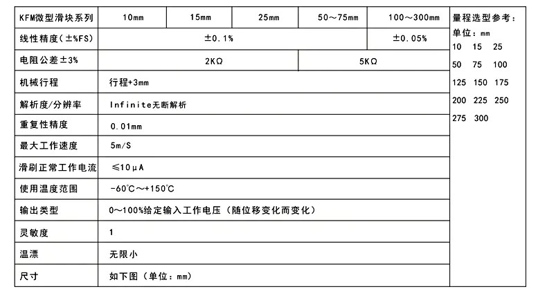 KFM微型滑塊式電阻尺(別名:電子尺,電位器,位移傳感器)原理:電位計原理,所有傳感器為位置測量型,用于調節系統(控制系統)和測量系統中,對位移和長度進行直接測量,輸出直流電壓信號,也可以通過內置或者外置的V/A變送模塊講信號轉換成標準的0-5V、0-10V或者4-20mA直流信號,也可以遠距離傳輸控制要求。KFM微型滑塊式電阻尺(別名:電子尺,電位器,位移傳感器)輸出位移變化:0-100%給定輸入工作電壓(隨位移變化而變化)。