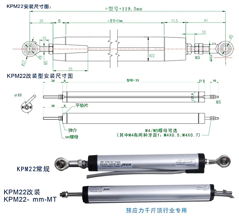 適用范圍:KPM是兩端固定安裝的鉸接運行方式,適用于較小機械行程且有擺動的位置檢測,對安裝的對中性無任何要求,如:裂縫測量監測,橋梁測量監測,注塑機頂針、鞋機、3D座椅、預應力千斤頂、機械手臂、機器人、取出機、磚機、陶瓷機械、水閘控制、木工機械、液壓機械等。