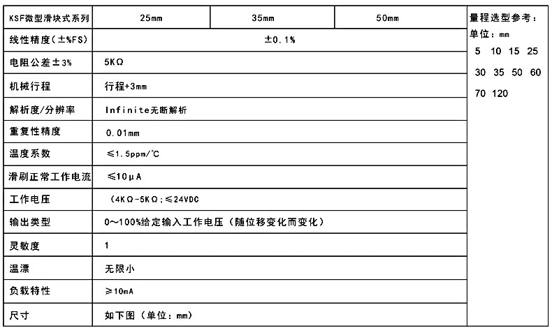 KSF微型滑塊式位移傳感器(別名:電子尺,電阻尺,電位器,位移傳感器)原理:電位計原理,所有傳感器為位置測量型,用于調節系統(控制系統)和測量系統中,對位移和長度進行直接測量,輸出直流電壓信號,也可以通過內置或者外置的V/A變送模塊講信號轉換成標準的0-5V、0-10V或者4-20mA直流信號,也可以遠距離傳輸控制要求。 KSF微型滑塊式位移傳感器(別名:電子尺,電阻尺,電位器,位移傳感器)輸出位移變化:0-100%給定輸入工作電壓(隨位移變化而變化)。