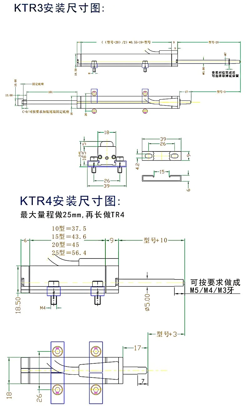 KTR內(nèi)置彈簧自復(fù)位式位移傳感器安裝尺寸: