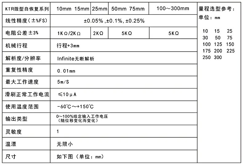 KTR內(nèi)置彈簧自復(fù)位式位移傳感器選型及技術(shù)參數(shù):