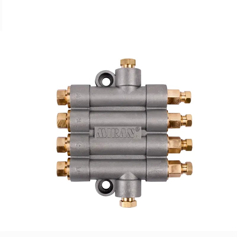 工作原理 A:計量活塞動作行程 B :傘形雙向閥動作行程見上圖,從潤滑泵壓送的油從主管A注入,并將傘形雙向閥B向推開流入,通過通路C壓送活塞室到F內。受壓力油作用下計量活塞向下動作彈簧G被壓縮蓄油,從而進行計量蓄油,當主管A內油壓被釋放〈即卸壓〉,傘形閥B因壓力差而動作,同時開啟吐出口E,于是活室內計量蓄油通過吐出口E送入油管H而將油輸送到潤滑點, 信號銷I當計量蓄油時突出.而供油給潤滑點時縮回,從而確認分配動作完成情況。 A: metering piston action schedule B: the action trip of the umbrella type two-way valve is shown in the figure above. The oil from the lubrication pump is injectedfrom the director A, and the umbrella-type two-way valve B is pushed open. Push the piston chamber to F through the channel C.The piston moves downward under the action of pressure oil.The spring G is compressed.Thus the measurement of oil storage.When the oil pressure is released in charge of A(the discharge pressure). The umbrella valve B moves with pressure difference. At the same time, it opens the outlet E, so the living room measures the oil storage.The oil is transported to the lubrication point by outlet E to the pipe H, and the signal pin I is prominent when measuring the oil storage. When the oil is supplied to the lubrication point, it is retracted to confirm the completion of the distribution.