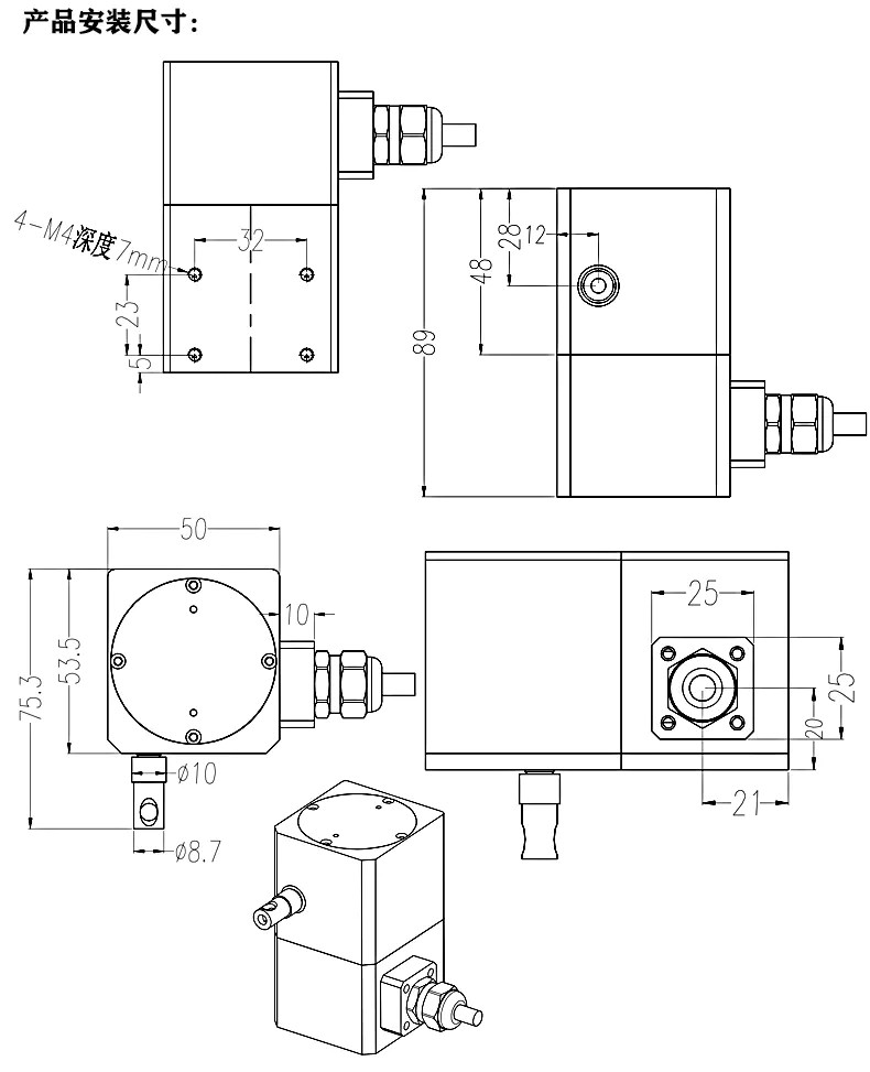 1,利用底部4個固定螺絲孔,依現場及機器安裝空間設施需要,直接安裝或另加保護或其他機械使用。