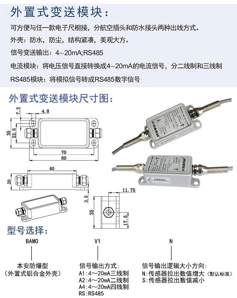 本安防爆型外置式位移傳感器變送模塊說明:普通的直線位移傳感器、電子尺、電阻尺及拉繩/拉線位移傳感器,都是電位計原理的位移傳感器,實際上就相當于一個電位器,通俗點講也叫:滑動變阻器,供電多少V電壓,輸出就是0-多少V電壓;即,客戶如果供電電壓是5V,那輸出直接就是0-5V。如果供電電壓是10V,那輸出就是0-10V。如果供電電壓是24V,那輸出就是0-24V。 如果供電電壓只有24V的,沒有5V或者是10V的電源,但是輸出卻想要0-5V或者0-10V及4-20mA、RS485,那就需要配我們的模塊即可。