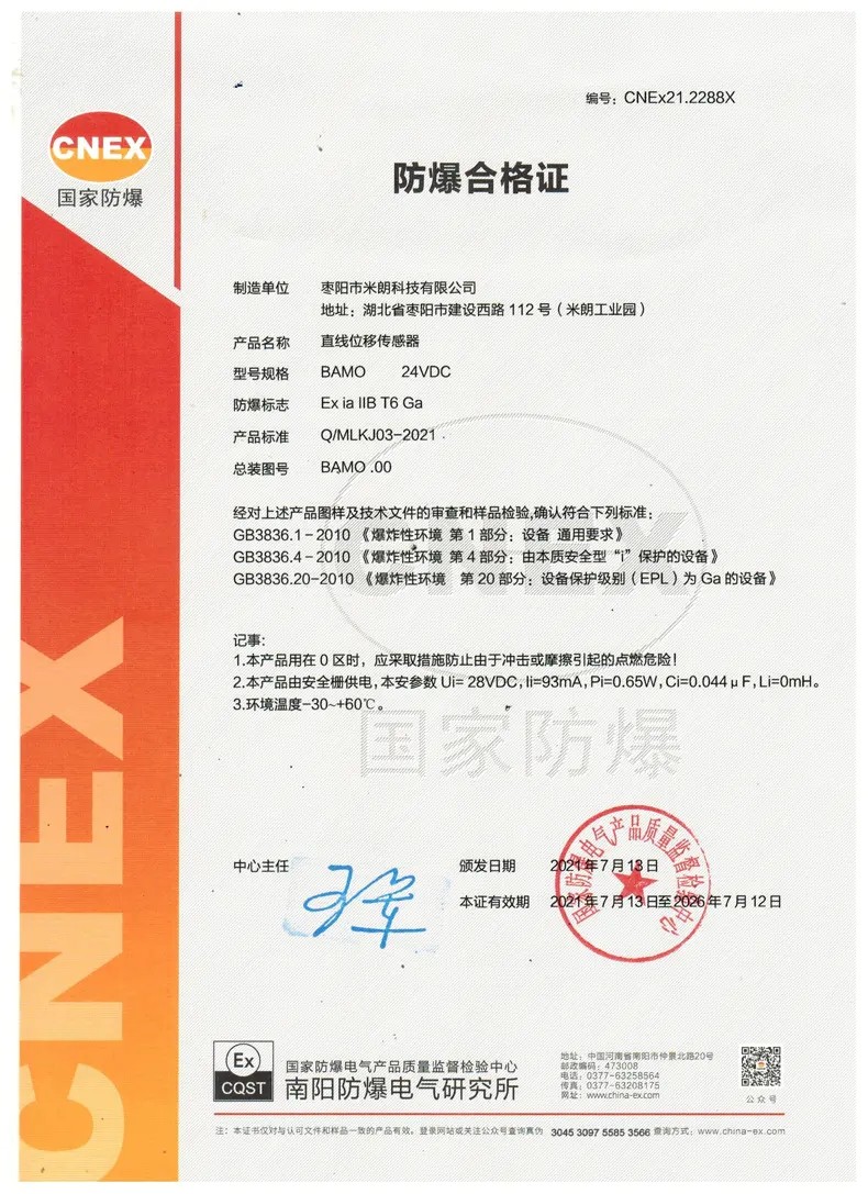 本安防爆型外置式位移傳感器轉換模塊的證書: