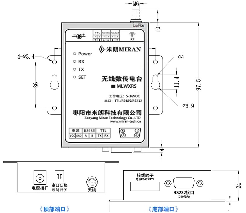 MLWXRS無線數傳電臺上面接口說明。