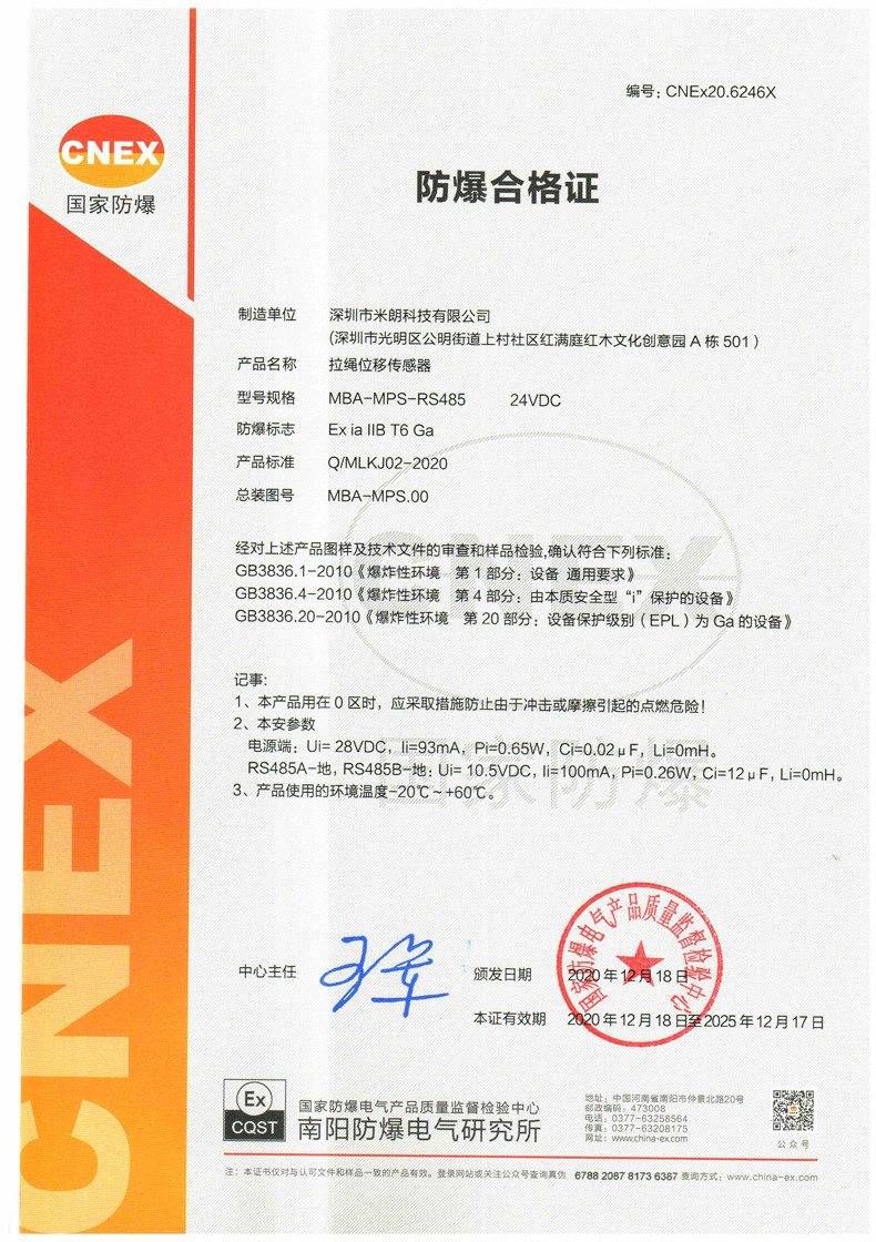 本安型拉繩/拉線位移傳感器證書(數字量信號輸出)適用于以下位移傳感器:MBA-MPS-XXS-RS485-EX(量程100-1000mm),MBA-MPS-XS-RS485-EX(量程100-1200mm)?,MBA-MPS-S-RS485-EX(量程100-1300mm)?,MBA-MPS-M-RS485-EX(量程1000-4000mm)?,MBA-MPS-L-RS485-EX(
