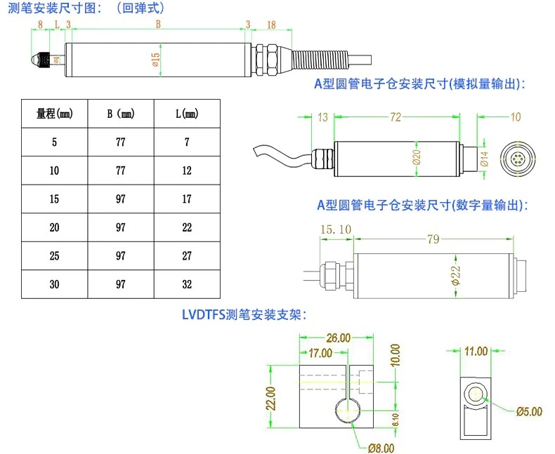 LVDTFS回彈式防水型位移傳感器特點: