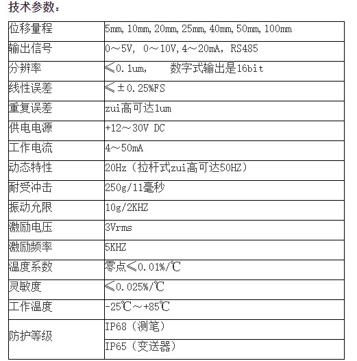 防水型差動變壓器式位移傳感器(LVDT)可廣泛應用于航天航空,機械, 建筑,紡織,鐵路,煤炭,冶金,塑料,化工以及科研院校等國民經(jīng)濟各行各業(yè),用來測量伸長,振動,物體厚度,膨脹等的高技術產(chǎn)品。