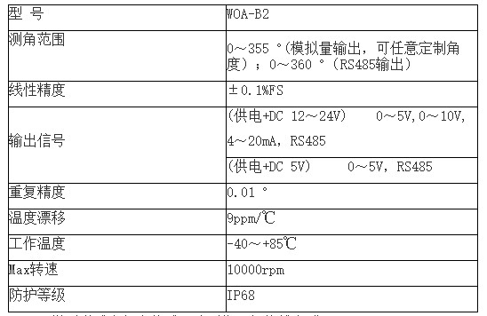 米朗科技WOA-B2系列角度傳感器采用磁感應原理(內部非接觸式)測量角度,具有無觸點、長壽命、高分辨、高頻響、低溫漂、優線性、防水、防塵、耐振抗沖、抗干擾等特點。廣泛應用于水、油、氣、振動、沖擊等多種惡劣工業環境中