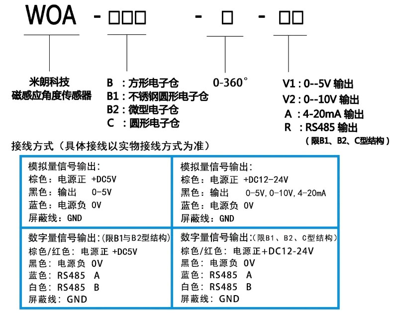 WOA-B2微型磁感應角度傳感器選型指導與接線方式: