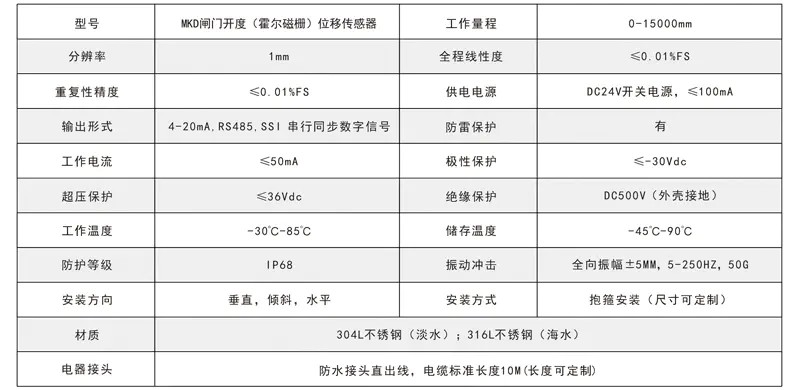 三、閘門開度(霍爾磁柵)位移傳感器技術(shù)參數(shù)及安裝尺寸: