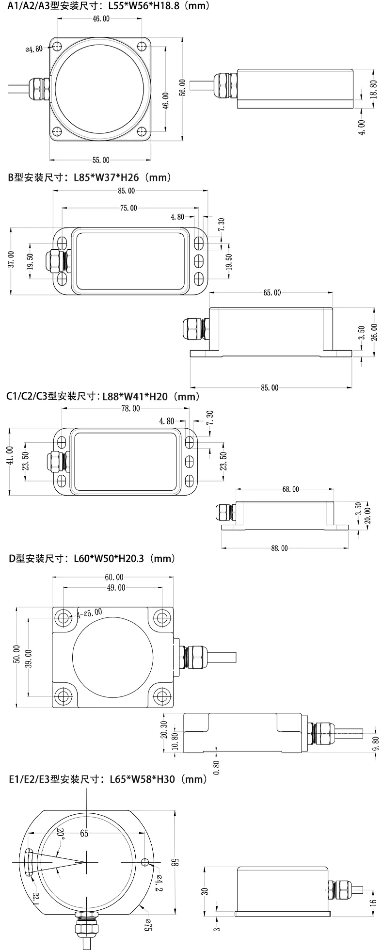 四、傾角傳感器安裝尺寸: